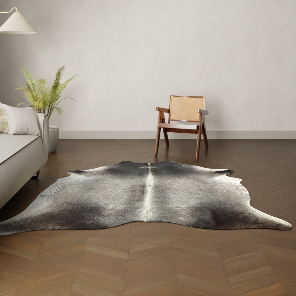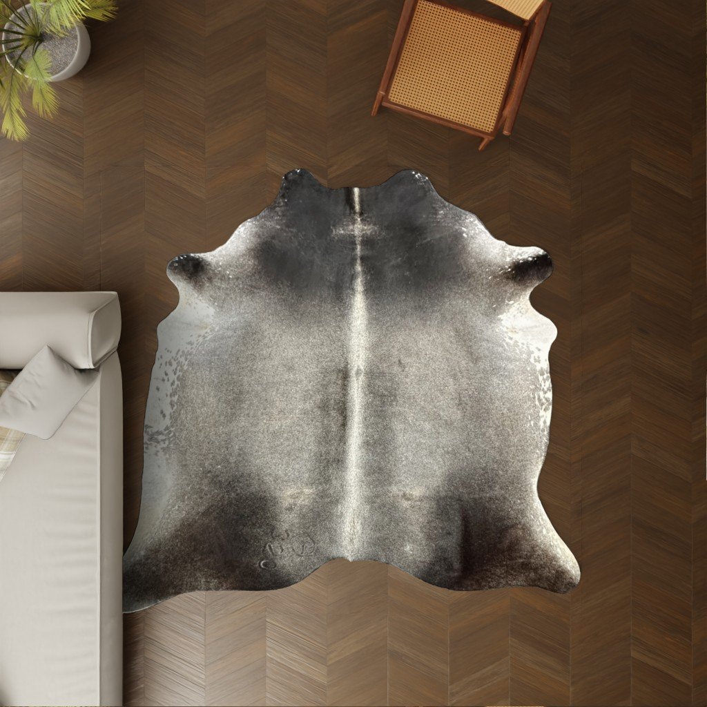 Kuhfell Teppich schwarz grau 230×210 cm. BEISPIELFOTO